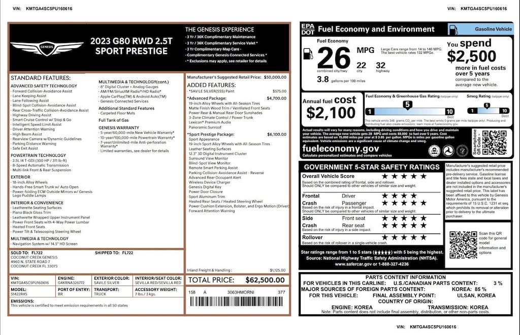 This car is an unbelievable value. I have a 3.5L Twin Turbo with AWD and the Prestige package (I highly recommend the Prestige package due to the Heads Up display and several other luxury options included). The owners manual leaves a lot to be desired. It is hard to find explanations of the numerous features. For example, I have two buttons, cryptically labeled, on the overhead panel where the dome light and sunroof controls reside. I cannot find the difference between the two buttons in the owners manual. Both light the dome light but I cannot figure out why there are two buttons for the light. That is just an example - the manual must have been translated from Korean, and poorly at that. Ride is smooth as silk, with windows closed a boom box next to my car is silent, acceleration is remarkable for a car as heavy as this. Gas mileage is terrible though. Around town, I get 16 mpg with a light foot. On the road, I get around 19 mpg. Wondering if there is something wrong with my fuel delivery system. Have not asked Genesis for valet pickup and drop-off of my car for service but based on comments in the G80 blog, dealers are reluctant to deliver on the promised service, not to mention they say loaner cars are not available.… - 5.0