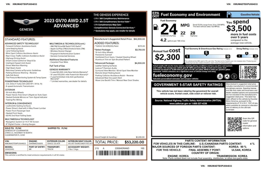 Genesis Certified with over 49,000 miles of Factory Warranty remaining! A CPO has more warranty than a new one; under the GENESIS CERTIFIED Program you get the remainder of the 10 YEAR/100,000 mile powertrain warranty AND IT EXTENDS THE BUMPER-TO-BUMPER WARRANTY TO 6YRS/75,000 miles from the in-service date that started on 09.03.2022. That is more than the 5/60 bumper-to-bumper warranty when it was new! You also receive; 3 years of Genesis Connected Services, 90 days XM, Rental Car Coverage, Towing & Travel Breakdown Coverage and free Roadside Assistance for 10 years. Click on ORIGINAL WINDOW STICKER on the Carfax to see all of the features. We have both remotes. Like new inside and out. Located at 20440 Interstate I-45 North, Spring, Tx minutes from The Woodlands, Tomball and Conroe. CALL US (346-589-8830) CLICK US (GenesisofSpring.com) or COME SEE US!!