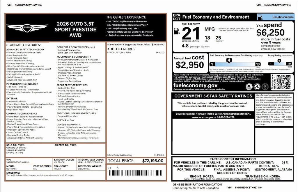 2026 Genesis GV70 AWD 3.5T Sport Prestige
