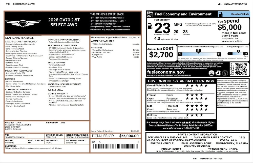 This Retired Courtesy Loaner is Genesis Certified with over 94,000 miles of Factory Warranty remaining! A CPO has more warranty than a new one; under the GENESIS CERTIFIED Program you get the remainder of the 10 YEAR/100,000 mile powertrain warranty AND IT EXTENDS THE BUMPER-TO-BUMPER WARRANTY TO 6YRS/75,000 miles from the in-service date that started on 09.30.2025. That is more than the 5/60 bumper-to-bumper warranty when it was new! You also receive; 3 years of Genesis Connected Services, 90 days XM, Rental Car Coverage, Towing & Travel Breakdown Coverage and free Roadside Assistance for 10 years. Click on ORIGINAL WINDOW STICKER on the Carfax to see all of the features. Although it is being sold as used, it has never been titled. Clean Carfax. We have both remotes. Like new inside and out. Located at 20440 Interstate I-45 North, Spring, Tx minutes from The Woodlands, Tomball and Conroe. CALL US (346-589-8830) CLICK US (GenesisofSpring.com) or COME SEE US!!