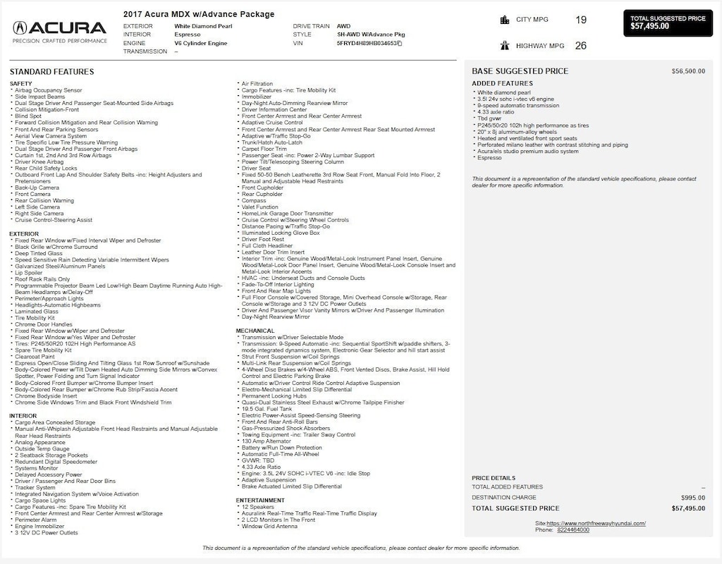 2017 Acura MDX 3.5L SH-AWD w/Advance Package w/only 80,453 miles. 3.5L V6 (290 hp) with a 9-speed automatic transmission. White Diamond Pearl with Espresso Milano Leather interior. Loaded with Navigation, Premium ELS Audio, Acura Watch Safety Tech, Surround View Camera, Heated and Cooled Front Seats, Remote Start, Heated 2nd Row Captain's Chair, and 20" Alloy Wheels. Way too many options to list see third picture for original window sticker. All four tires have 7/32 tread with DOT date codes of 36/21. Located at 20440 Interstate I-45 North, Spring, Tx minutes from The Woodlands, Tomball and Conroe. CALL US (346-589-8830) CLICK US (GenesisofSpring.com) or COME SEE US!!