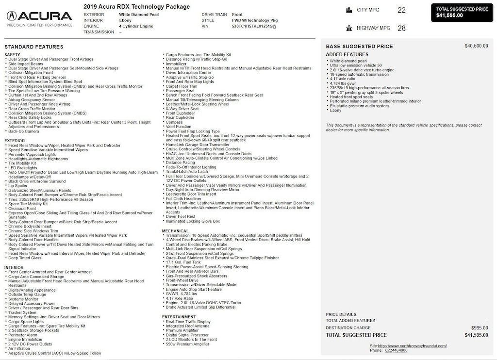 2019 Acura RDX Technology Package w/only 72,506 miles. 2.0L Turbo (272 hp) with a 10-speed automatic transmission. White Diamond Pearl with Ebony Milano Leather interior. Loaded with Acura Navigation System w/3D View, 12-Speaker ELS Studio Audio System, AcuraWatch, Power Moonroof, Heated Front Seats, Memory Setting, Driver Seat/Mirrors, Multi-Zone Climate Control, and 19" Pewter Wheels. Way too many options to list see third picture for original window sticker. Clean Carfax! All four tires have 7/32 tread with DOT date codes of 01/22. Located at 20440 Interstate I-45 North, Spring, Tx minutes from The Woodlands, Tomball and Conroe. CALL US (346-589-8830) CLICK US (GenesisofSpring.com) or COME SEE US!!