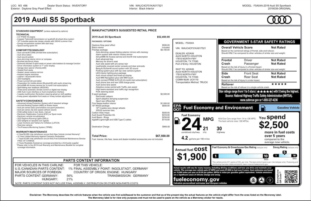 2019 Audi S5 Sportback Prestige quattro w/only 55,089 miles. 3.0L Turbo (349 hp) with a 8-speed automatic transmission. Daytona Gray Pearl with Black Fine Nappa Leather interior. Loaded with Audi Virtual Cockpit w/Heads-Up Display, MMI Navigation w/MMI Touch, Bang & Olufsen Sound System, Parking System Plus w/Top View Camera, Memory Setting for Driver, S-Sport Pkg., Sport Adaptive Damping Suspension, Carbon Atlas Inlays, Audi Beam Rings, LED Interior Lighting, and 19" Wheel Pkg. Way too many options to list see third picture for original window sticker. Clean Carfax! Located at 20440 Interstate I-45 North, Spring, Tx minutes from The Woodlands, Tomball and Conroe. CALL US (346-589-8830) CLICK US (GenesisofSpring.com) or COME SEE US!!