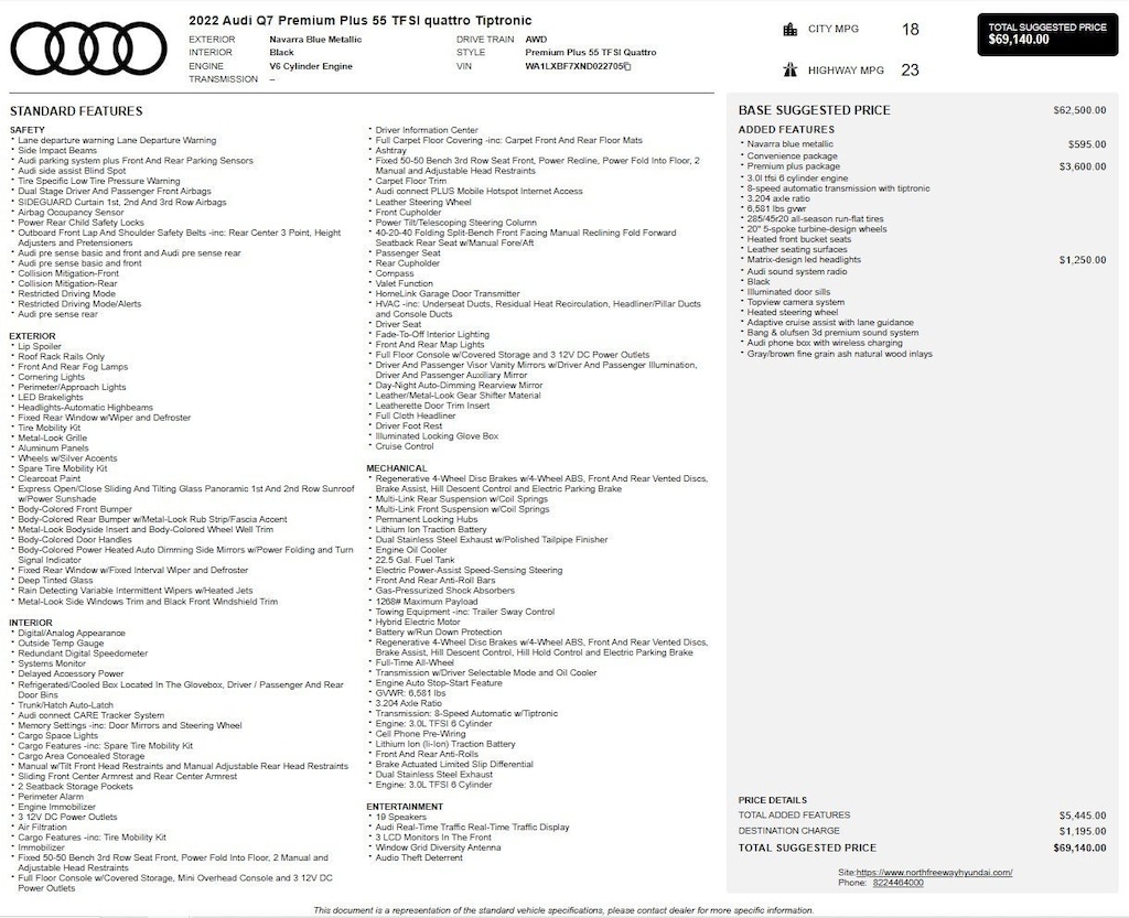 2022 Audi Q7 55 Premium Plus quattro w/only 21,008 miles. 3.0L Turbo (335 hp) with a 8-speed automatic transmission. Navarra Blue Metallic with Black Leather interior. Loaded with Matrix-Design LED Headlights, Bang & Olufsen 3D Premium Sound System, Top View Camera, Wireless Charging, Heated Front Seats, Heated Steering Wheel, Adaptive Cruise Assist w/Lane Guidance, Convenience Pkg., and 20" 5-Spoke Turbine-Design Wheels . Way too many options to list see third picture for original window sticker. Estimated Warranty Start Date of 09/16/2022 with 10 months of factory limited bumper-to-bumper and 10 months of factory limited powertrain warranty remaining. One Owner! All four tires have 7/32 tread with DOT date codes of 12/22. Located at 20440 Interstate I-45 North, Spring, Tx minutes from The Woodlands, Tomball and Conroe. CALL US (346-589-8830) CLICK US (GenesisofSpring.com) or COME SEE US!!