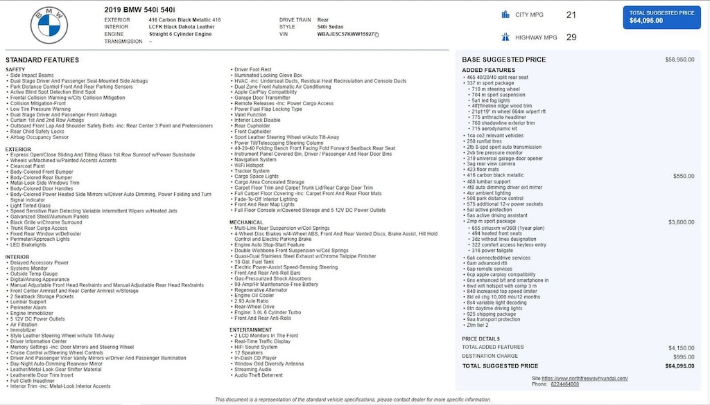 2019 BMW 5 Series 540i w/only 52,586 miles. 3.0L Turbo (335 hp) with a 8-speed automatic transmission. Carbon Black Metallic (Black/Blue) with Black Dakota Leather interior. Loaded with M Sport Pkg., 8.8" Voice-Activated Navigation, LED Headlights, Sunroof, Active Driving Assist, Blind Spot Detection, Heated/16-Way Front Seats, Keyless Entry, and a Power Trunk. Way too many options to list see third picture for original window sticker. All four tires have 6/32 tread with DOT date codes of 08/24. Located at 20440 Interstate I-45 North, Spring, Tx minutes from The Woodlands, Tomball and Conroe. CALL US (346-589-8830) CLICK US (GenesisofSpring.com) or COME SEE US!!