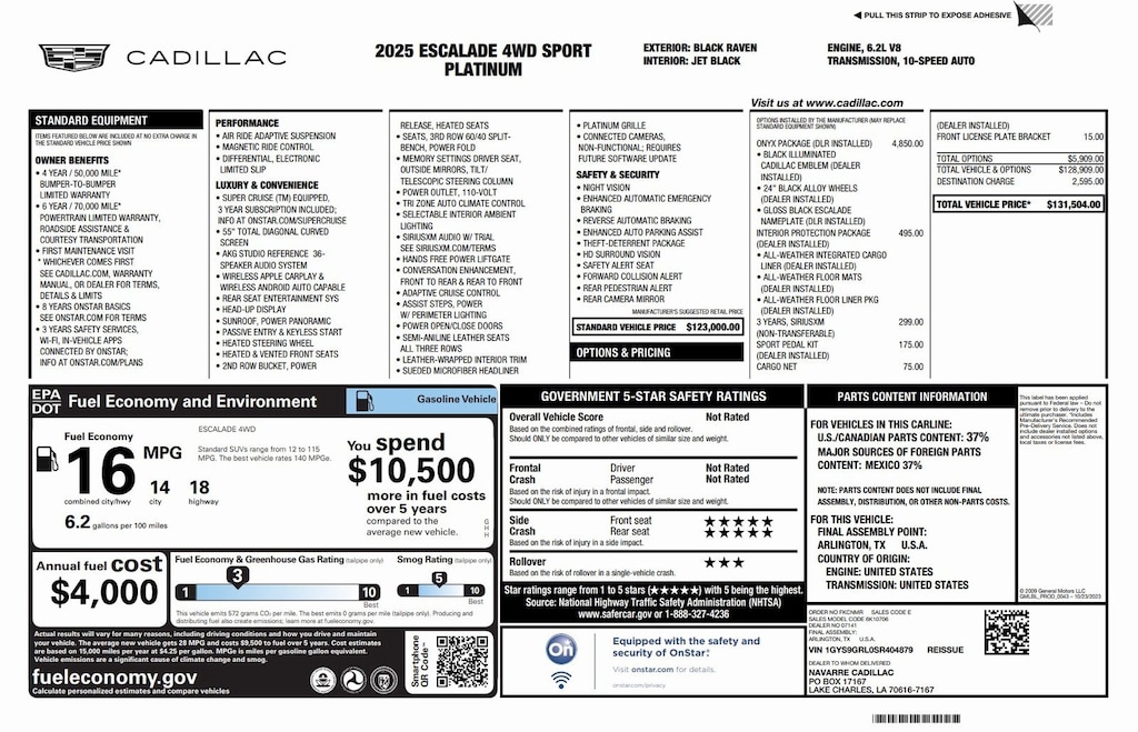 2025 Cadillac Escalade Sport Platinum w/only 1693 miles. 6.2L Turbo (420 hp) with a 10-speed automatic transmission. Black Raven with Jet Black Semi-Aniline Leather interior. Loaded with Onyx Pkg., Black illuminated Cadillac Emblem, 24" Gloss Black Wheels, 55" Total Curved Screen, AKG Studio Reference 36-Speaker Audio System, Air Ride Suspension, Magnatic Ride Control, Rear Seat Entertainment, Heads-up Display, Heated and Cooled Front Seats, and Power Steps. Way too many options to list see third picture for original window sticker. Estimated Warranty Start Date of 09/19/2025 with 45 months of factory limited bumper-to-bumper and 69 months of factory limited powertrain warranty remaining. Clean Carfax! Located at 20440 Interstate I-45 North, Spring, Tx minutes from The Woodlands, Tomball and Conroe. CALL US (346-589-8830) CLICK US (GenesisofSpring.com) or COME SEE US!!