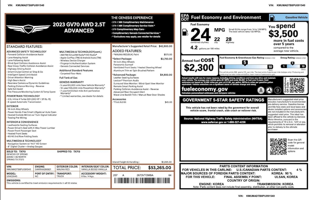 Genesis Certified with over 57,000 miles of Factory Warranty remaining! A CPO has more warranty than a new one; under the GENESIS CERTIFIED Program you get the remainder of the 10 YEAR/100,000 mile powertrain warranty AND IT EXTENDS THE BUMPER-TO-BUMPER WARRANTY TO 6YRS/75,000 miles from the in-service date that started on 11.19.2022. That is more than the 5/60 bumper-to-bumper warranty when it was new! You also receive; 3 years of Genesis Connected Services, 90 days XM, Rental Car Coverage, Towing & Travel Breakdown Coverage and free Roadside Assistance for 10 years. Click on ORIGINAL WINDOW STICKER on the Carfax to see all of the features. We have both remotes. Like new inside and out. Located at 20440 Interstate I-45 North, Spring, Tx minutes from The Woodlands, Tomball and Conroe. CALL US (346-589-8830) CLICK US (GenesisofSpring.com) or COME SEE US!!