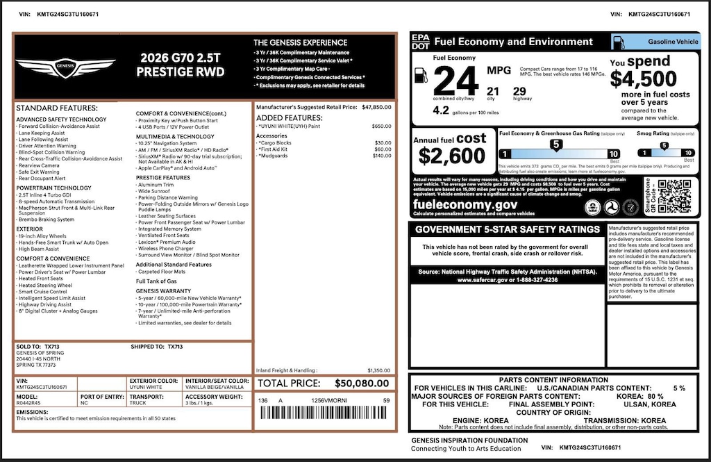 Genesis Certified with over 94,000 miles of Factory Warranty remaining! A CPO has more warranty than a new one; under the GENESIS CERTIFIED Program you get the remainder of the 10 YEAR/100,000 mile powertrain warranty AND IT EXTENDS THE BUMPER-TO-BUMPER WARRANTY TO 6YRS/75,000 miles from the in-service date that started on 06.30.2025. That is more than the 5/60 bumper-to-bumper warranty when it was new! You also receive; 3 years of Genesis Connected Services, 90 days XM, Rental Car Coverage, Towing & Travel Breakdown Coverage and free Roadside Assistance for 10 years. Click on ORIGINAL WINDOW STICKER on the Carfax to see all of the features. We have both remotes. Like new inside and out. Located at 20440 Interstate I-45 North, Spring, Tx minutes from The Woodlands, Tomball and Conroe. CALL US (346-589-8830) CLICK US (GenesisofSpring.com) or COME SEE US!!