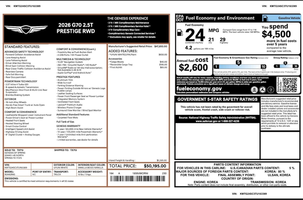 This Retired Courtesy Loaner is Genesis Certified with over 94,000 miles of Factory Warranty remaining! A CPO has more warranty than a new one; under the GENESIS CERTIFIED Program you get the remainder of the 10 YEAR/100,000 mile powertrain warranty AND IT EXTENDS THE BUMPER-TO-BUMPER WARRANTY TO 6YRS/75,000 miles from the in-service date that started on 09.02.2025. That is more than the 5/60 bumper-to-bumper warranty when it was new! You also receive; 3 years of Genesis Connected Services, 90 days XM, Rental Car Coverage, Towing & Travel Breakdown Coverage and free Roadside Assistance for 10 years. Click on ORIGINAL WINDOW STICKER on the Carfax to see all of the features. Although it is being sold as used, it has never been titled. Clean Carfax. We have both remotes. Like new inside and out. Located at 20440 Interstate I-45 North, Spring, Tx minutes from The Woodlands, Tomball and Conroe. CALL US (346-589-8830) CLICK US (GenesisofSpring.com) or COME SEE US!!