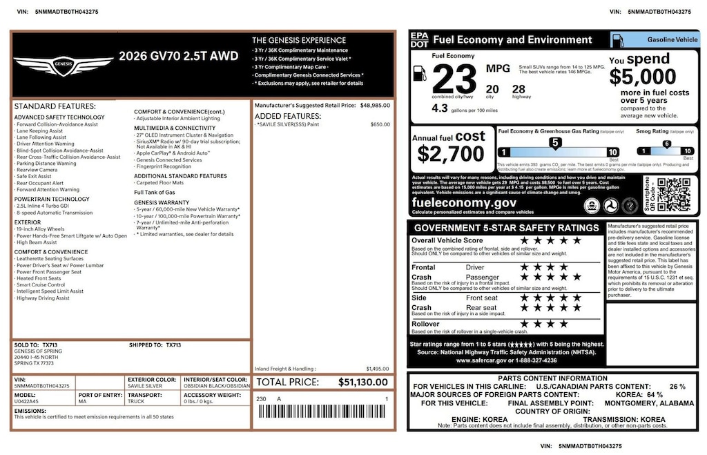 This Retired Courtesy Loaner is Genesis Certified with over 95,000 miles of Factory Warranty remaining! A CPO has more warranty than a new one; under the GENESIS CERTIFIED Program you get the remainder of the 10 YEAR/100,000 mile powertrain warranty AND IT EXTENDS THE BUMPER-TO-BUMPER WARRANTY TO 6YRS/75,000 miles from the in-service date that started on 09.02.2025. That is more than the 5/60 bumper-to-bumper warranty when it was new! You also receive; 3 years of Genesis Connected Services, 90 days XM, Rental Car Coverage, Towing & Travel Breakdown Coverage and free Roadside Assistance for 10 years. Click on ORIGINAL WINDOW STICKER on the Carfax to see all of the features. Although it is being sold as used, it has never been titled. Clean Carfax. We have both remotes. Like new inside and out. Located at 20440 Interstate I-45 North, Spring, Tx minutes from The Woodlands, Tomball and Conroe. CALL US (346-589-8830) CLICK US (GenesisofSpring.com) or COME SEE US!!