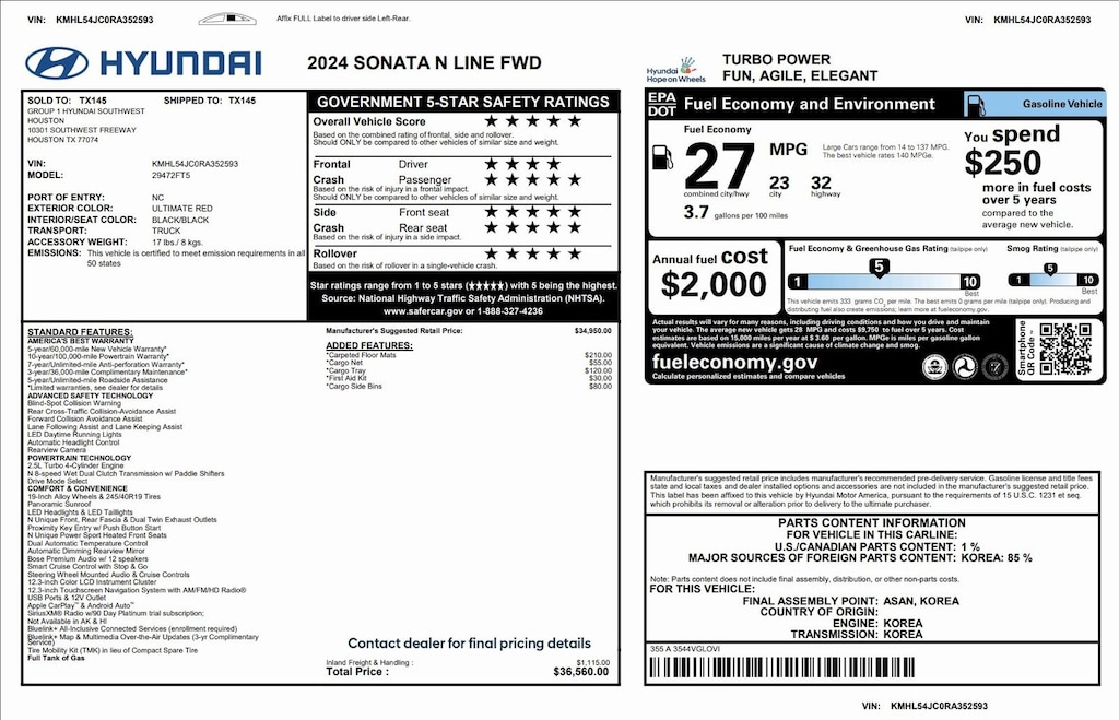 2024 Hyundai Sonata N Line w/only 20,603 miles. 2.5L Turbo (290 hp) with a 8-speed automatic transmission. Ultimate Red with Black Suede and Leather interior. Loaded with 12.3-Inch Touchscreen Navigation w/Bose Premium Audio, Apple/Android Carplay, Panoramic Sunroof, Smart Cruise Control, Blind Sport Collision Warning, Rear Camera, LED Headlights/LED Taillights, and 19" Alloy Wheels. Way too many options to list see third picture for original window sticker. Estimated Warranty Start Date of 03/24 with 41 months of factory limited bumper-to-bumper and 41 months of factory limited powertrain warranty remaining. All four tires have 7/32 tread. Located at 20440 Interstate I-45 North, Spring, Tx minutes from The Woodlands, Tomball and Conroe. CALL US (346-589-8830) CLICK US (GenesisofSpring.com) or COME SEE US!!