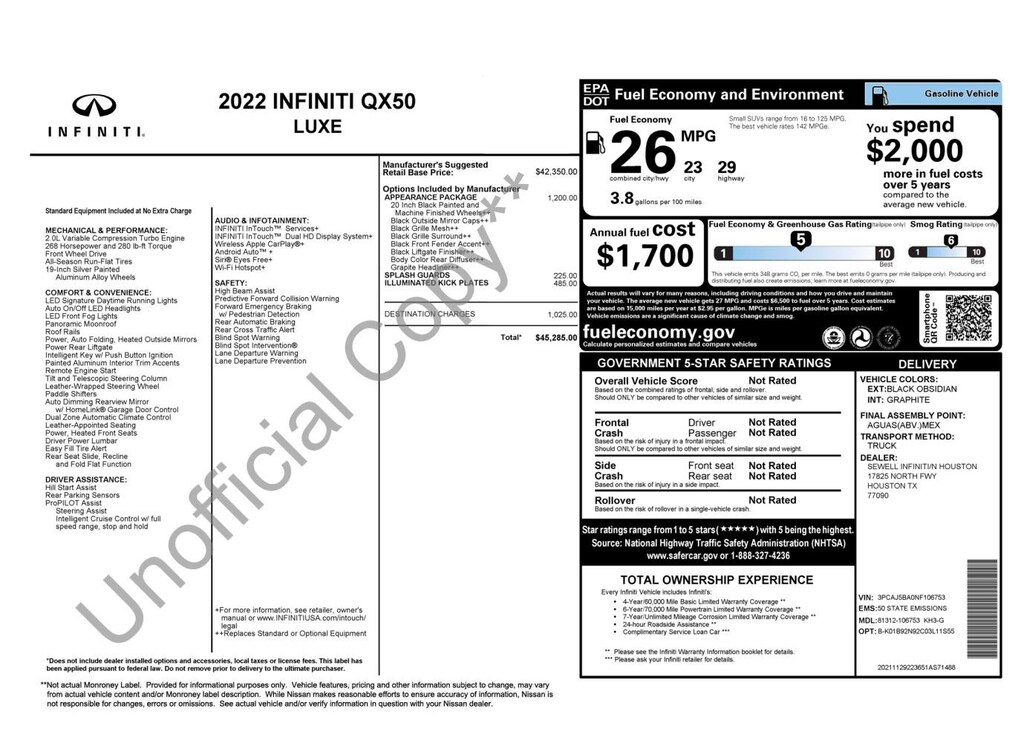 2022 INFINITI QX50 LUXE w/only 66,867 miles. 2.0L Turbo (268 hp) with an automatic transmission. Black Obsidian with Black Leather interior. Loaded with Panoramic Moonroof, Wireless Apple Carplay, ProPilot Assist, Blind Spot Warning/Intervention, Heated Front Seats w/Lumbar, and a Power Liftgate. Way too many options to list see third picture for original window sticker. All four tires have 8/32 tread with DOT date codes of 47/25. Located at 20440 Interstate I-45 North, Spring, Tx minutes from The Woodlands, Tomball and Conroe. CALL US (346-589-8830) CLICK US (GenesisofSpring.com) or COME SEE US!!