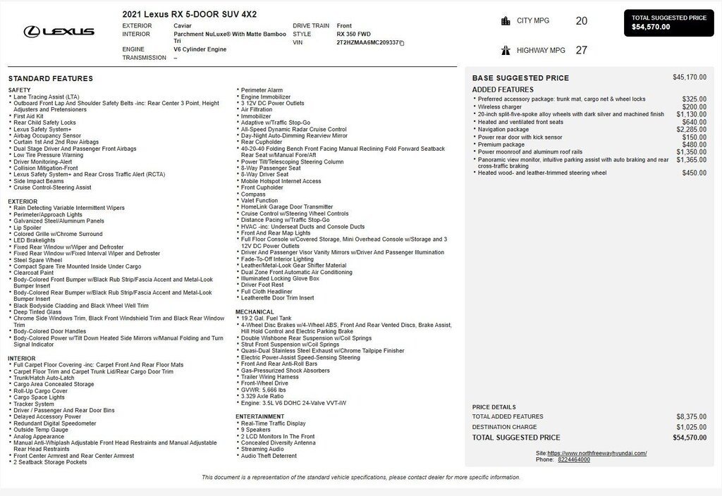 2021 Lexus RX 350 w/only 20,196 miles. 3.5L V6 (295 hp) with a 8-speed automatic transmission. Caviar (Black) with Parchment NuLuxe interior. Loaded with Navigation Pkg., Premium Pkg., Power Moonroof, Panoramic View monitor, Intuitive Parking Assist w/ Auto Braking, Wireless Charger, Heated and Ventilated Front Seats, Heated Wood & Leather Steering Wheel, Power Rear Door w/Kick Sensor, and 20" Split-Five-Spoke Wheels. Way too many options to list see third picture for original window sticker. Estimated Warranty Start Date of 06/15/2021 with 18 months of factory limited powertrain warranty remaining. Clean Carfax! All four tires have 6/32 tread. Located at 20440 Interstate I-45 North, Spring, Tx minutes from The Woodlands, Tomball and Conroe. CALL US (346-589-8830) CLICK US (GenesisofSpring.com) or COME SEE US!!