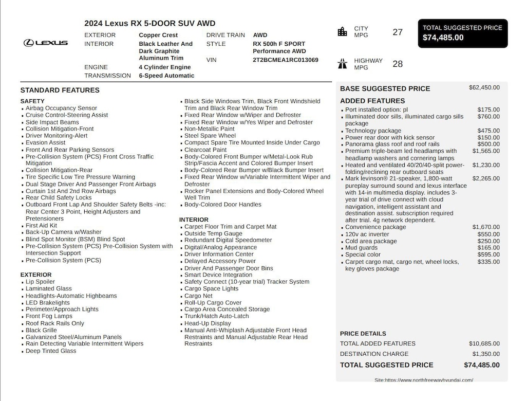 2024 Lexus RX 500h F SPORT Performance AWD w/only 10,949 miles. 2.4L Hybrid Turbo (274 hp) with a 6-speed automatic transmission. Copper Crest (Rose Gold) with Black Leather and Dark Graphite Aluminum Trim interior. Loaded with Convenience Pkg., Technology Pkg., Panoramic Glass Roof, Heated and Ventilated Front Seats, Premium Triple -Beam LED Headlamps, Mark Levinson 21-Speaker Surround Sound, 14-Inch Display with Navigation. Way too many options to list see third picture for original window sticker. Estimated Warranty Start Date of 02/2024 with 22 months of factory limited bumper-to-bumper and 46 months of factory limited powertrain warranty remaining. Clean Carfax! All four tires have 7/32 tread with DOT date codes of 41/23. Located at 20440 Interstate I-45 North, Spring, Tx minutes from The Woodlands, Tomball and Conroe. CALL US (346-589-8830) CLICK US (GenesisofSpring.com) or COME SEE US!!