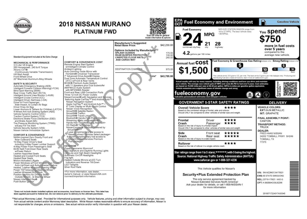 2018 Nissan Murano FWD Platinum w/only 109,890 miles. 3.5L V6 (260 hp) with an automatic transmission. Gun Metallic (Gray) with Graphite Leather interior. Loaded with Navigation, Bose Premium Audio 11-Speaker w/Duel Subwoofer, Apple/Android Auto, Panoramic Sunroof, Ambient Lighting, Heated and Cooled Front Seats, Duel Zone Climate Control, Heated Rear Seats, and Remote Start. Way too many options to list see third picture for original window sticker. Clean Carfax! All four tires have 6/32 tread with DOT date codes of 38/22. Located at 20440 Interstate I-45 North, Spring, Tx minutes from The Woodlands, Tomball and Conroe. CALL US (346-589-8830) CLICK US (GenesisofSpring.com) or COME SEE US!!